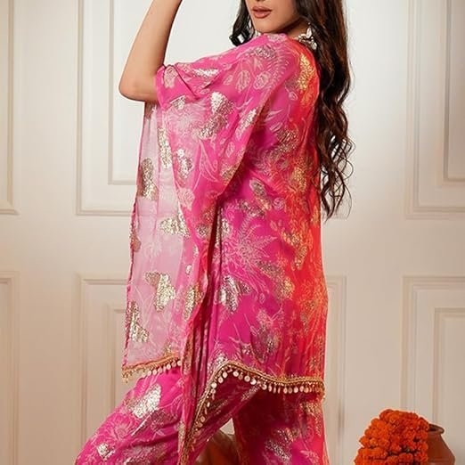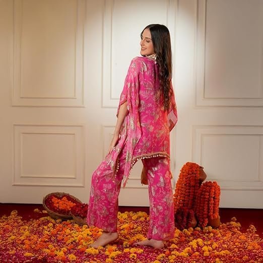 - ✨ Festive Indo Western Co-ord Set: Noor co-ord set for women comes in a striking festive pink shade with delicate golden motifs, perfectly blending ethnic charm and modern elegance, making it ideal for weddings, festive parties, and celebration events.
