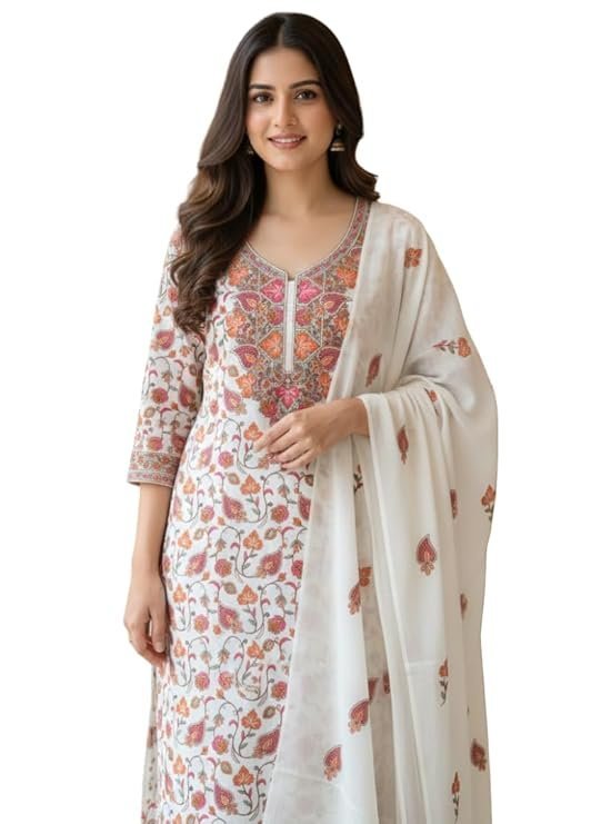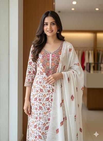 • DUPATTA DETAILS: Matching white dupatta adorned with delicate floral motifs that complement the kurta’s print pattern