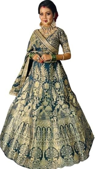Women's Bridal Lehenga Choli, Heavy Embroidered, Teal and Gold, TraditionalWomen’s Bridal Lehenga Choli, Heavy Embroidered, Teal and Gold, Traditional